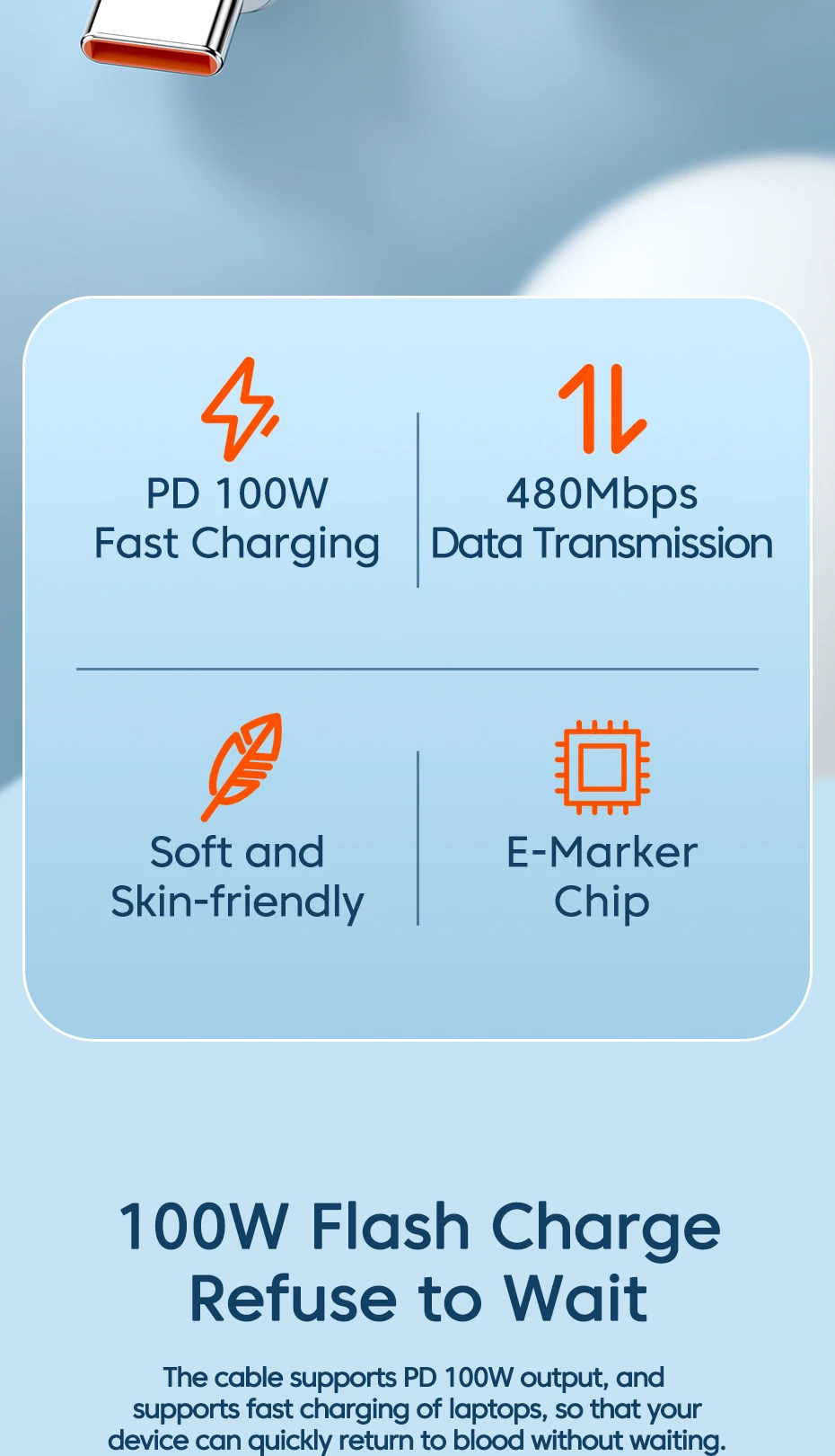 This Toocki 100W Type-C Colour TQ-X35 cable supports 100W/5A PD fast charging, making it ideal for charging high-power devices such as laptops, smartphones, and tablets. It is also compatible with data transfer speeds of up to 480Mbps.